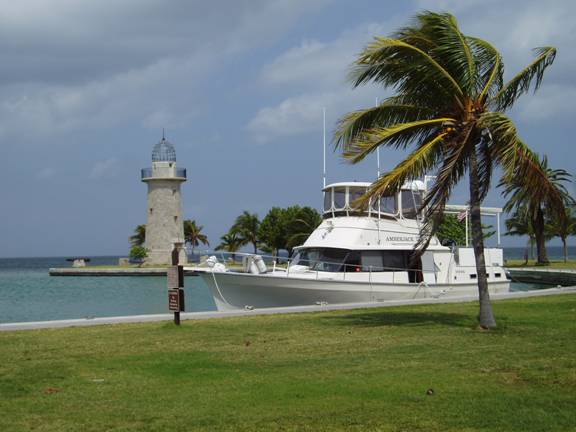 Today, the lighthouse, (which never functioned), the pavilion, and the concrete lined harbor remain. There is a solar powered bathroom building, and several of the original outbuildings. The house is gone. There is a small beach on the Atlantic side, and campsites line the beach. Part of the ocean side was roped off as a nesting site for sea turtles and birds. Access to the harbor is via a channel that carries 5 or 6 feet at low tide. The harbor is lined with concrete bulkheading with strong cleats. There is a wide walkway around the entire harbor The key is populated with palms and other tropical plants. The grassy areas are mown regularly. This is a premium place to tie up overnight. There is no water or electric available. The dockage cost is $ 15 per night. For us Golden Age Passport holders, it is $ 7.50 per night.