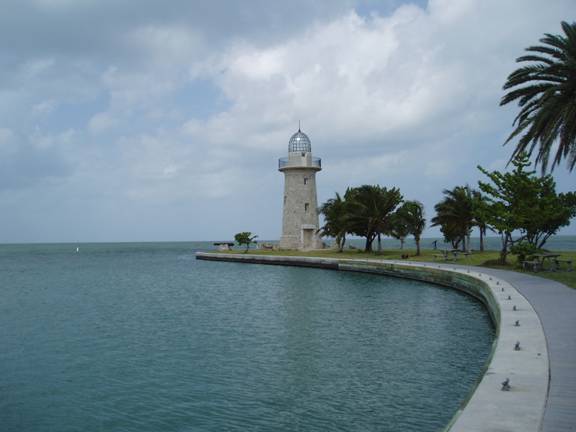 Soon we are in Biscayne Bay and heading south. The guidebook speaks briefly of a small Cay called Boca Chita, so I decide to head over to it and see if it would be a good place to spend the night. Boca Chita Cay is located south of Key Biscayne and north of Key Largo, in the string of small keys that form the dividing line between Biscayne Bay and the Atlantic Ocean. Biscayne Bay and many of the cays form a national park, and Boca Chita is part of the Park. Boca Chita was created from a mangrove stand in the late 1920s or early 30s when southeastern Florida was being overdeveloped. The key was created by bringing in fill to a level of 17 feet above the former mangrove stand. The developer installed a beautiful 65-foot lighthouse made from the native coral rock. He also built a 2-story house, a generator building, a garage, and a very spacious pavilion, also made of native coral rock. In 1937, it was purchased by Mark Honeywell, founder of the heating controls company. Honeywell used the key as a retreat and party site until his wife, Olive, fell there. She perished in their house in Miami a few months later from injuries suffered in the fall. This caused Honeywell to be unhappy with the place and he eventually sold it. Several other owners followed, the house disappeared, presumably in a storm, and eventually the US Park Service purchased the key.